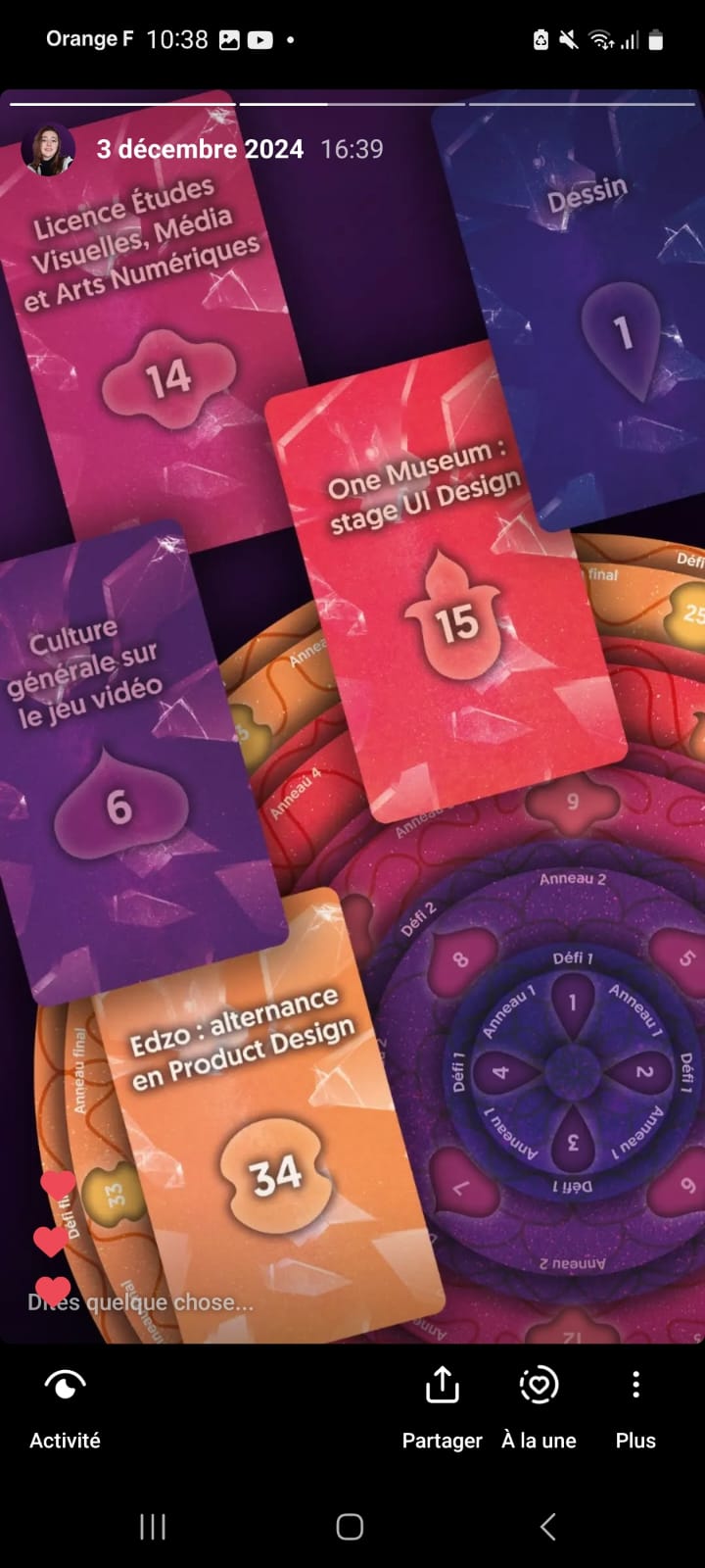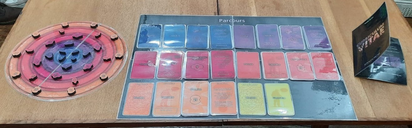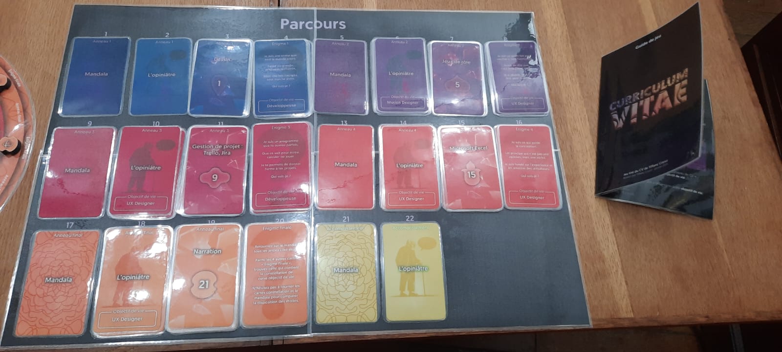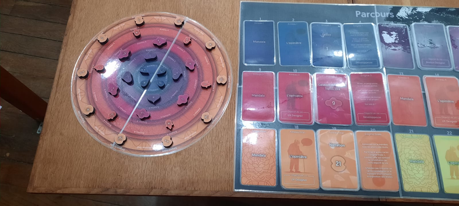 À chaque anneau du mandala, du centre vers l'extérieur, vous devez deviner quelles cartes "Fragments de CV" sont liées à l'objectif de vie que vous avez tiré au début du jeu (par exemple : Autrice). À chaque carte trouvée, vous ajoutez son jeton associé sur le mandala.