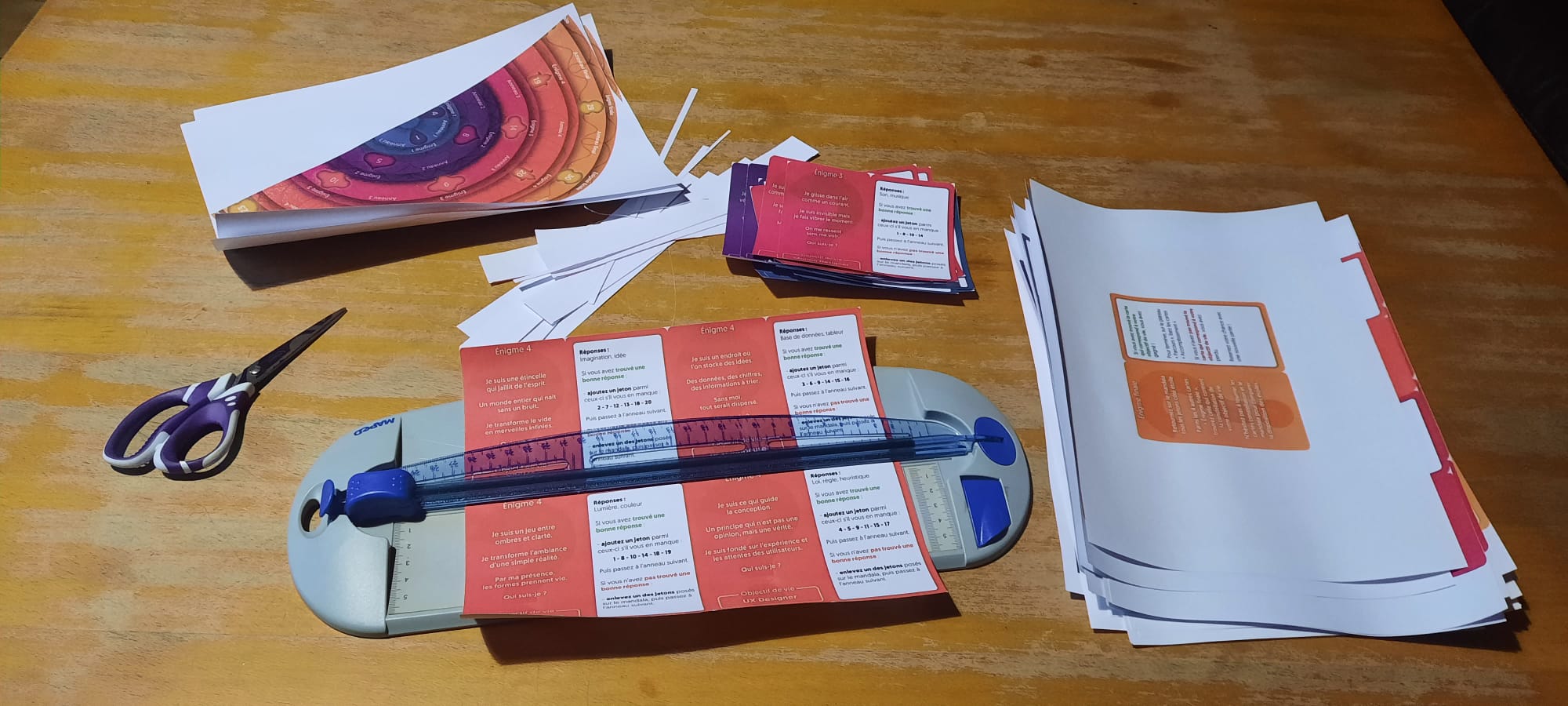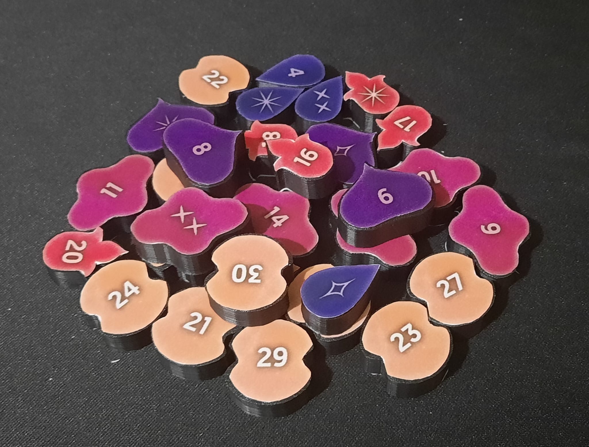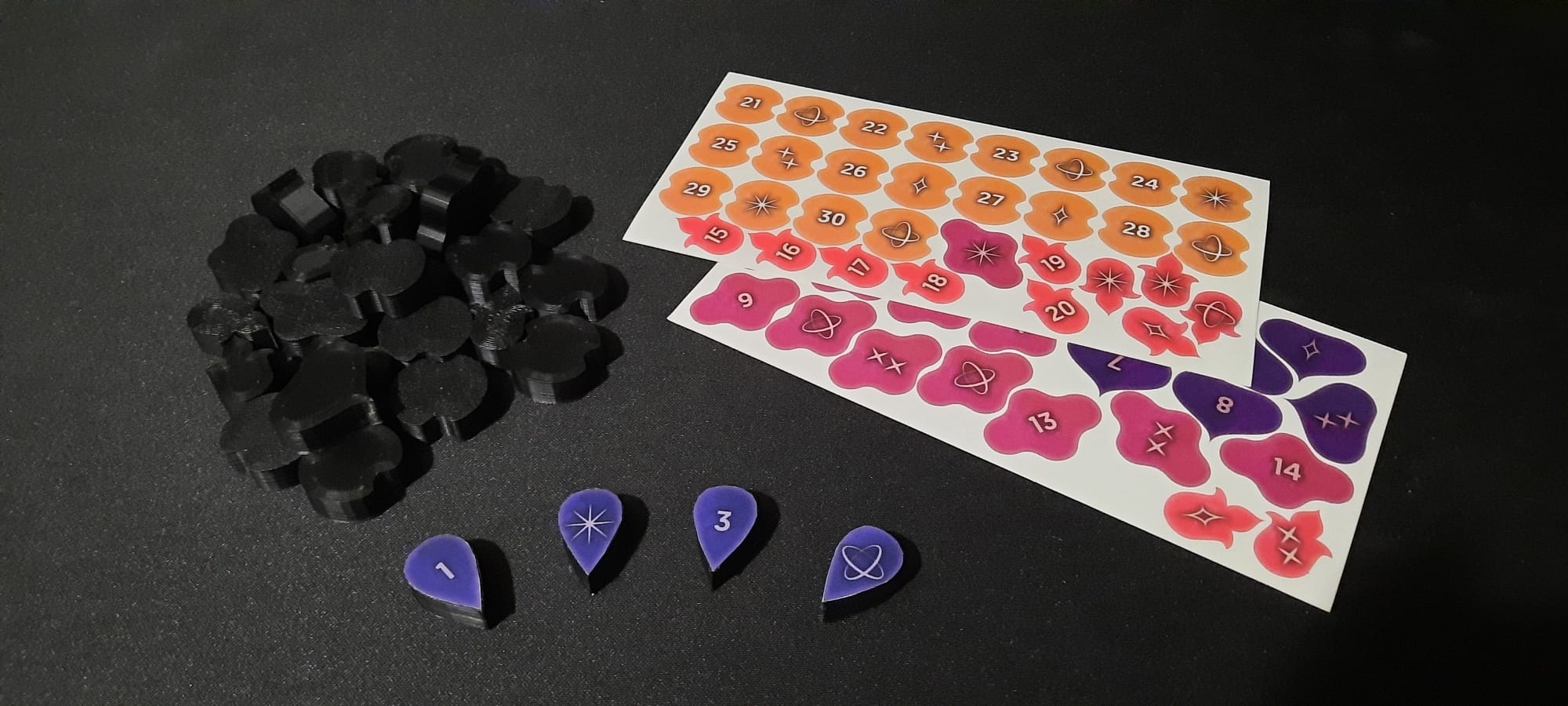 Pour la version finale du jeu, j'ai modélisé les jetons sur Blender et les ai imprimé en 3D. J'ai commandé leurs autocollants sur Vistaprint. J'ai également plastifié les 75 cartes, les deux plateaux et le guide de jeu.
