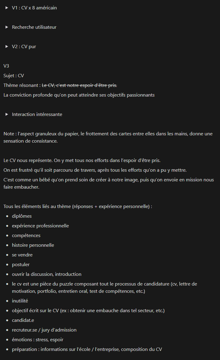 Je me suis alors essayée à d'autres concepts de jeux, qui se révélaient soit trop complexes, soit trop éloignés du concept de CV, soit tout simplement pas amusants.