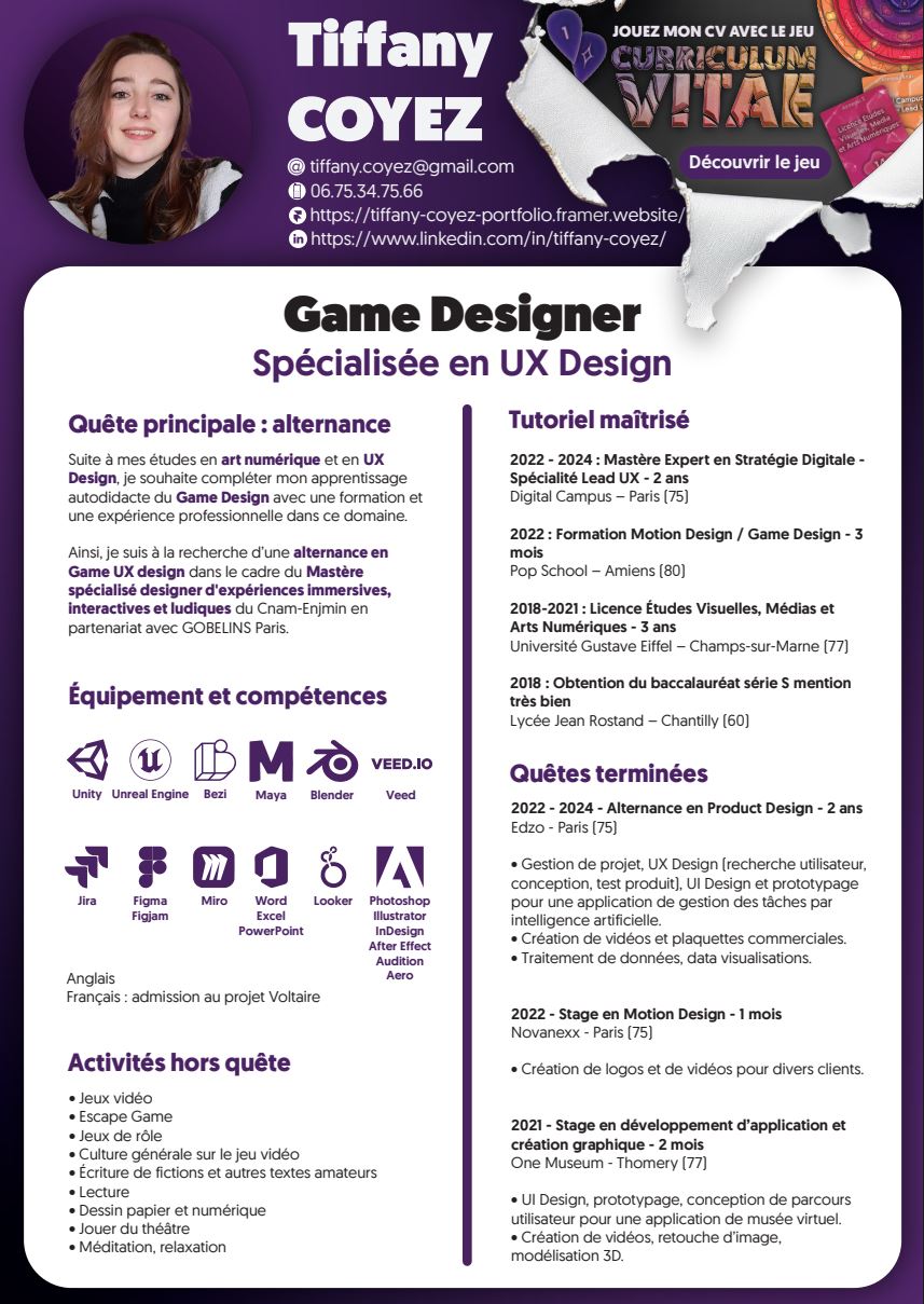 J'ai ainsi voulu me prêter à l'exercice pour une adaptation jeu de mon CV. L'avantage d'un tel format est aussi de pouvoir présenter un objet physique en entretien, pour davantage d'impact.