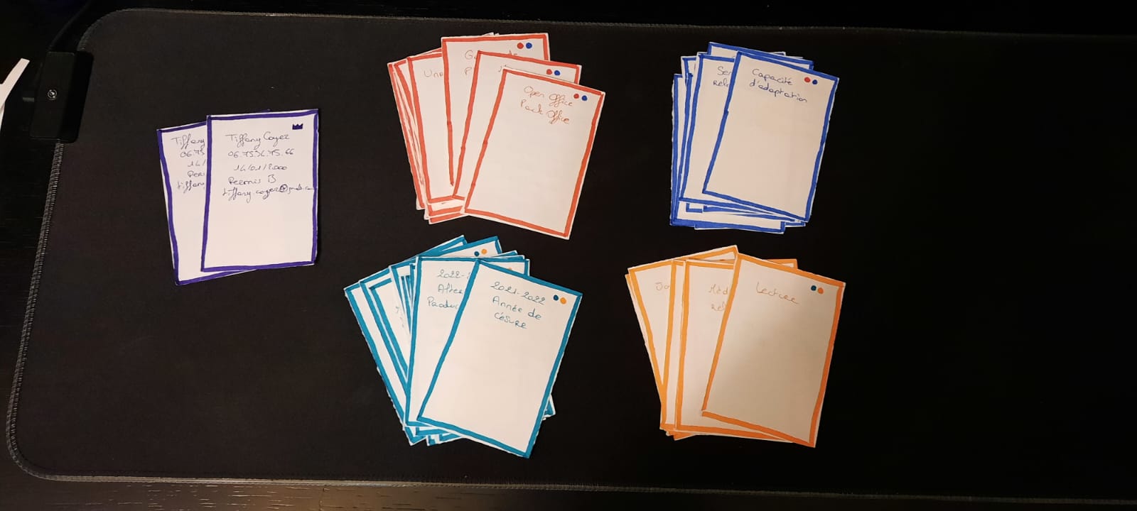 J'ai alors réalisé un premier prototype d'un jeu inspiré du Uno, utilisant des morceaux de mon CV rangés en 4 catégories. Les effets des différentes catégories se combinent pour vaincre son adversaire. La victoire consiste à être le premier à ne plus avoir de cartes.