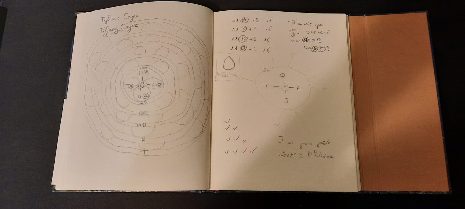 J'ai ensuite mis en place progressivement une première version sur papier. Le motif du mandala est utilisé, étant une forme artistique et donc fortement associée au sensible. Le joueur doit se construire un objectif de vie en construisant parallèlement un motif particulier sur le mandala.