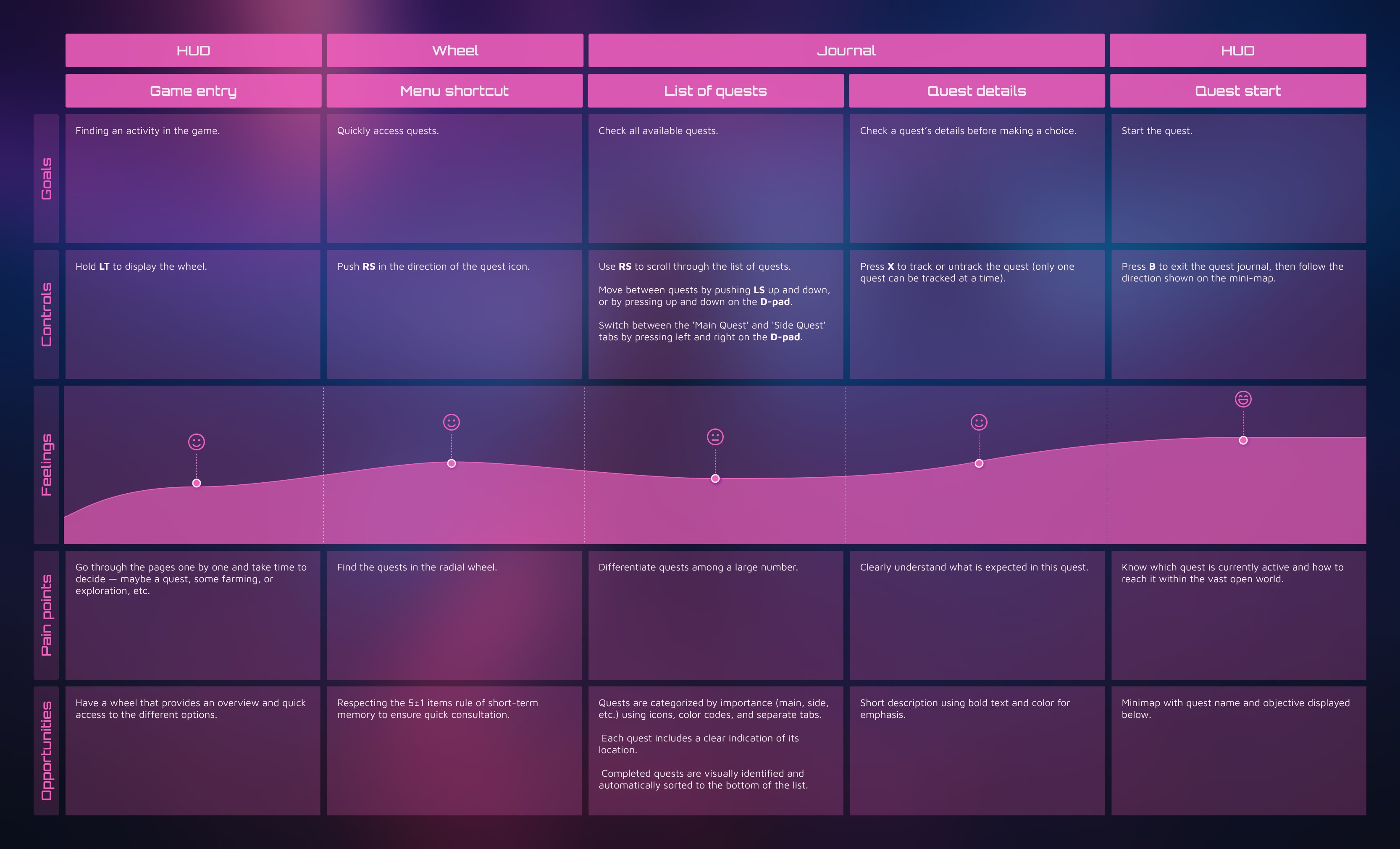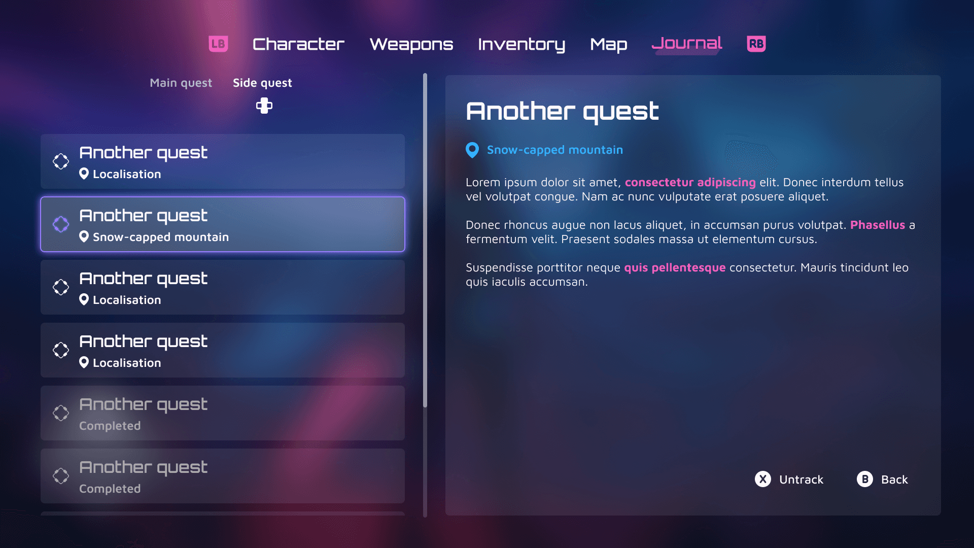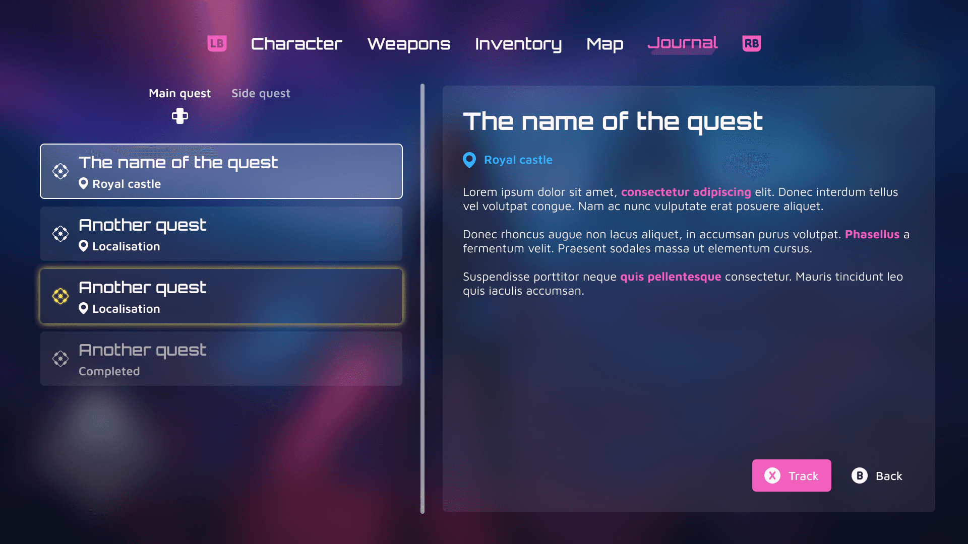 J’ai aussi conçu l’écran du journal de quêtes, pensé pour faire le lien entre narration et objectifs, tout en gardant un visuel clair, organisé… et immersif.